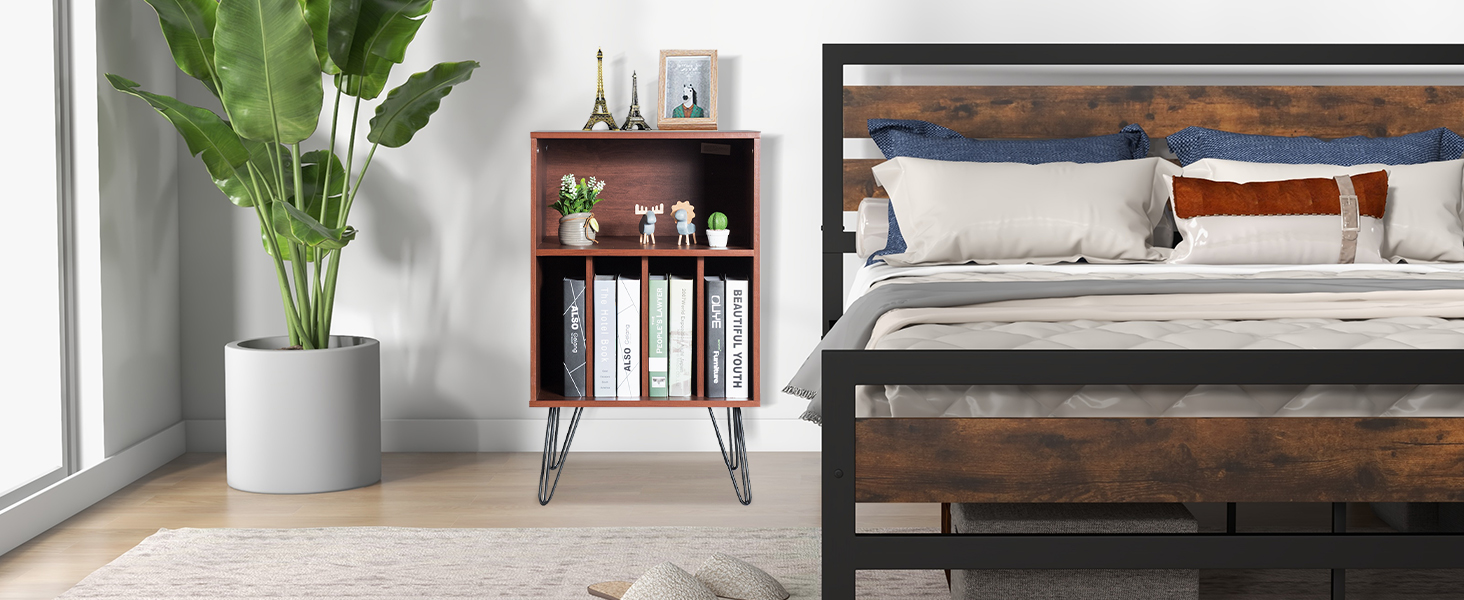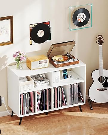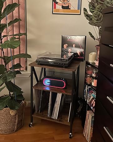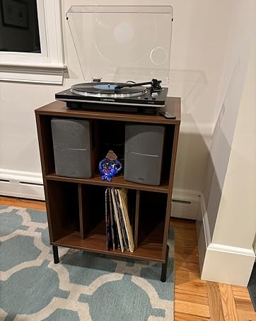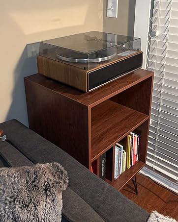 Giantex Record Player Stand, Turntable Stand Holds up to 150 Albums, Mid-Century Vinyl Storage Cabinet Table with Metal Legs, Record Player Holder End Table for Bedroom Living Room, Brown